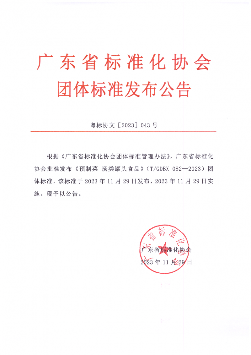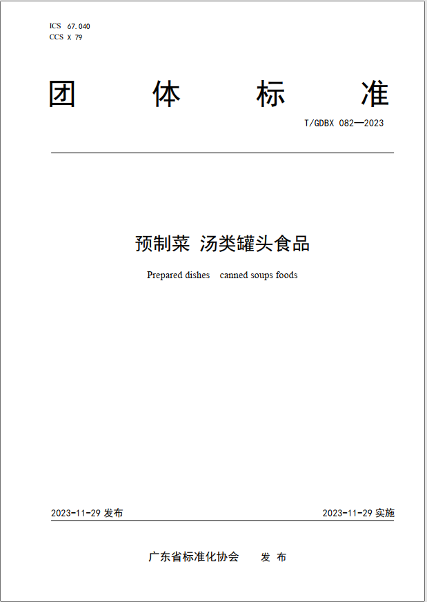 根據《廣東省標準化協會團體標準管理辦法》,廣東省標準化協會批準發布由廣東省科學院江門產業技術研究院有限公司主導制定的《預制菜 湯類罐頭食品》(T/GDBX 082—2023)團體標準,該標準于2023年11月29日發布,2023年11月29日實施。現予以公告。