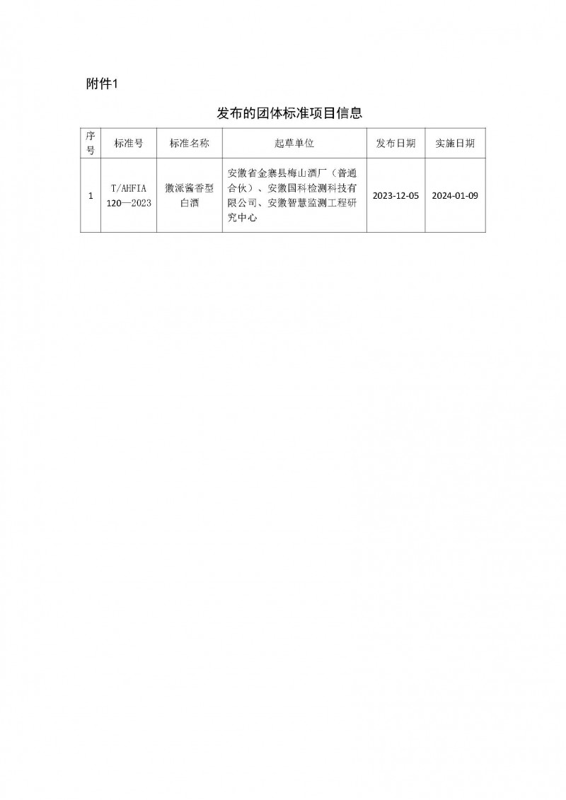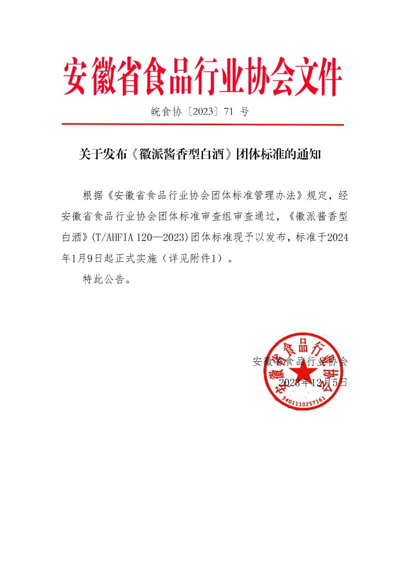 安徽省食品行業協會關于發布《徽派醬香型白酒》團體標準的通知(皖食協[2023]71號)