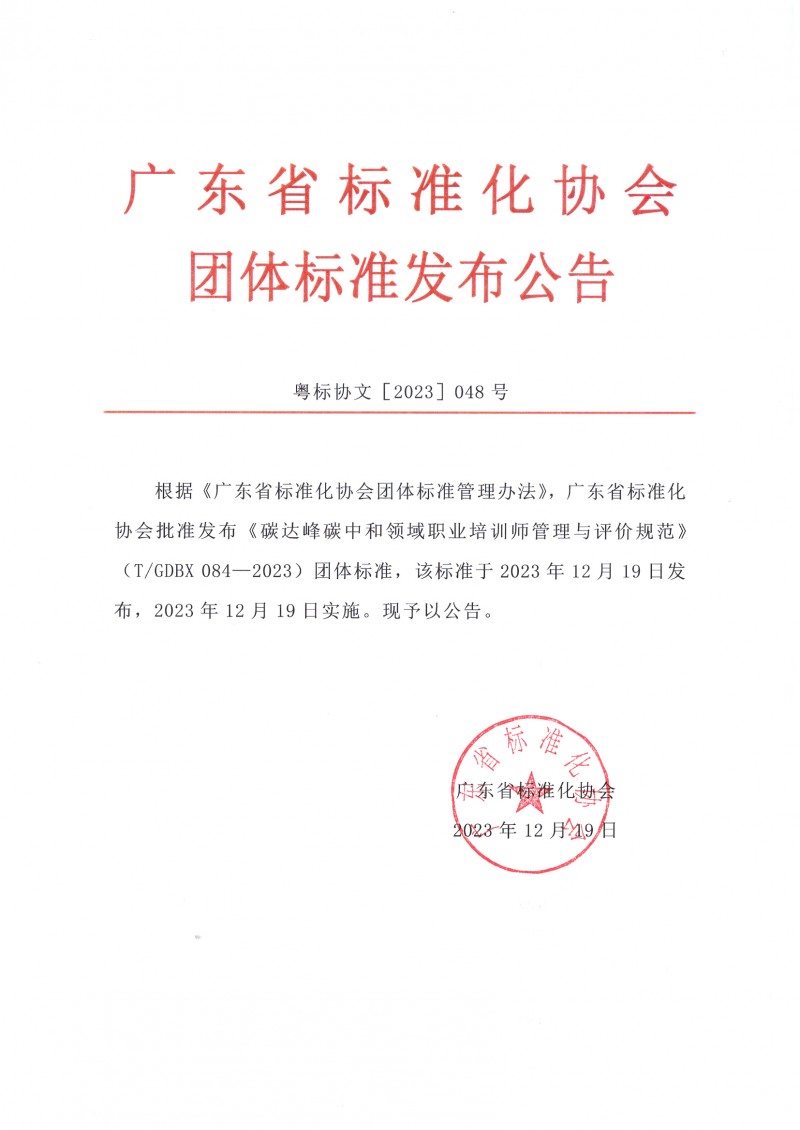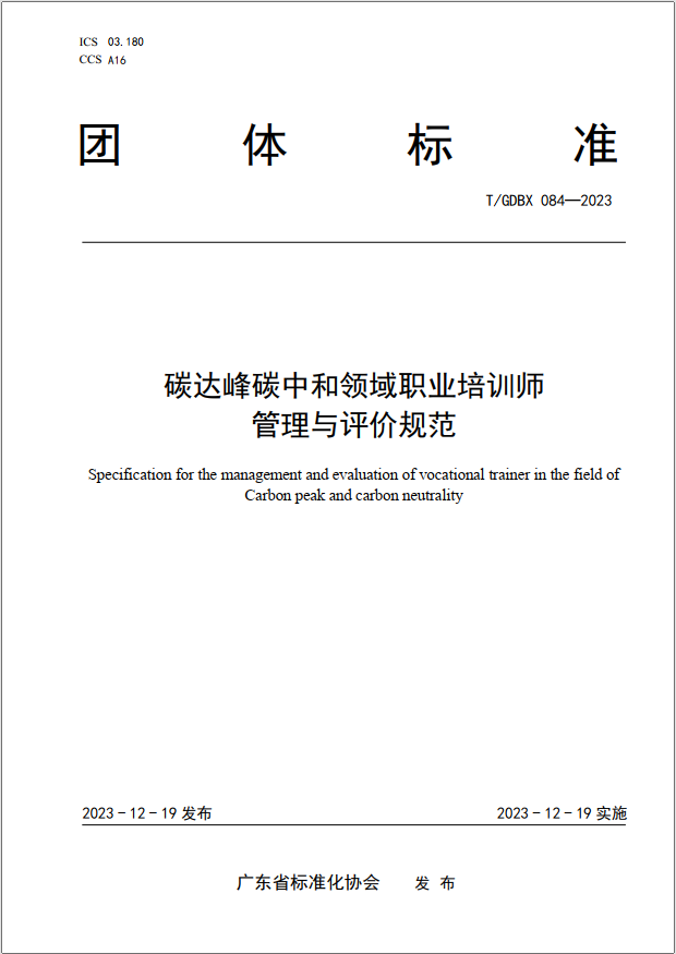 根據(jù)《廣東省標準化協(xié)會團體標準管理辦法》,廣東省標準化協(xié)會批準發(fā)布《碳達峰碳中和領域職業(yè)培訓師管理與評價規(guī)范》(T/GDBX 084—2023)團體標準,該標準于2023年12月19日發(fā)布,2023年12月19日實施。現(xiàn)予以公告。
