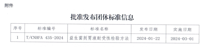 中國營養保健食品協會批準發布《益生菌劑胃液耐受性檢驗方法》團體標準(T/CNHFA 435-2024),現予公告,自2024年3月1日起實施。