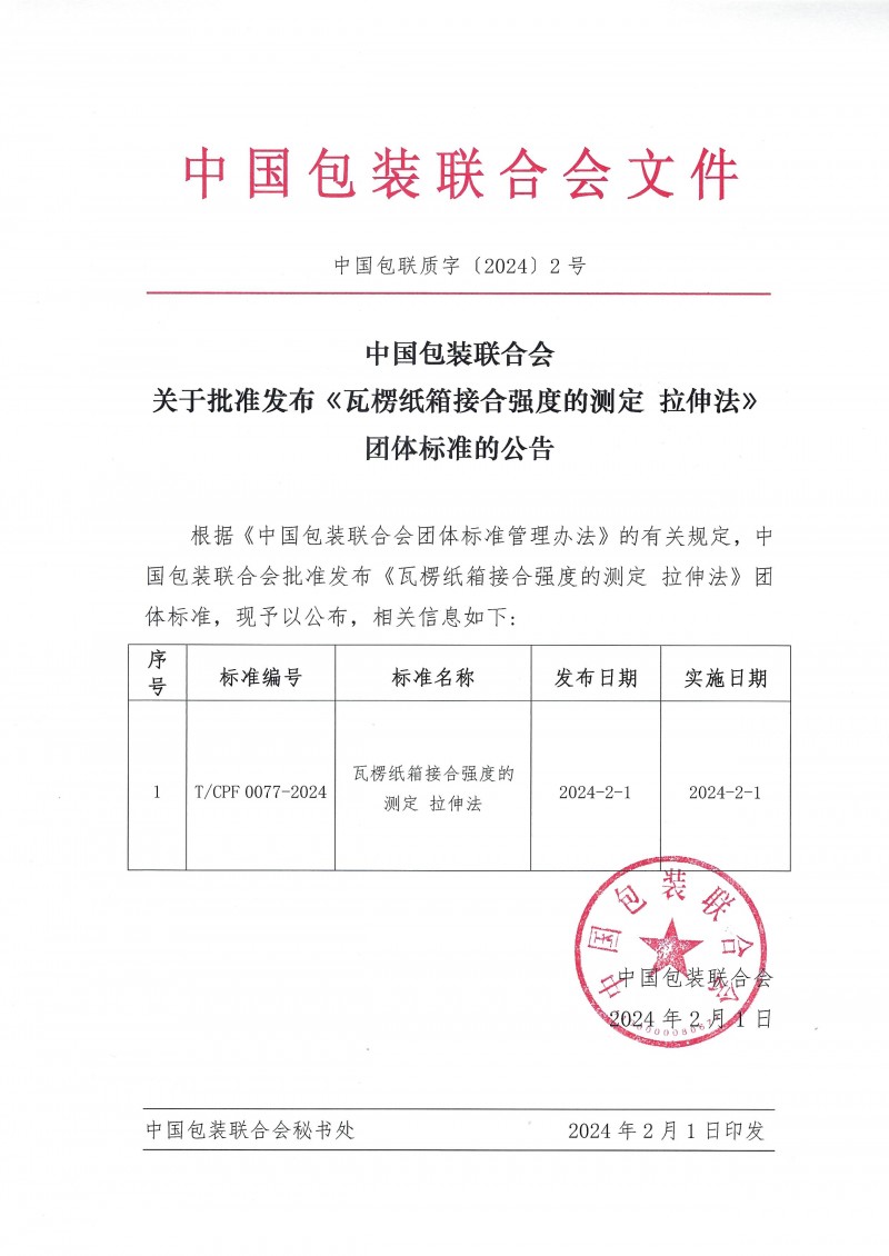 中國包裝聯合會關于批準發布《瓦楞紙箱接合強度的測定 拉伸法》團體標準的公告(中國包聯質字〔2024〕2號)