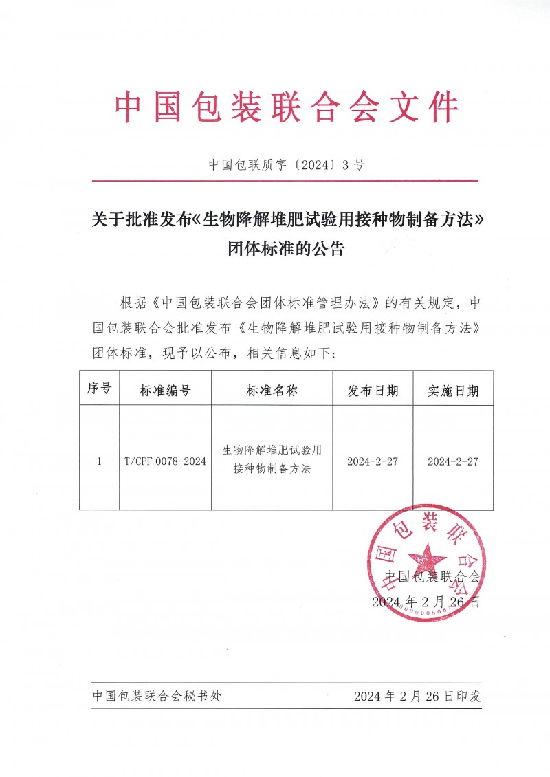 中國包裝聯合會關于批準發布《生物降解堆肥試驗用接種物制備方法》團體標準的公告(中國包聯質字[2024]3號)
