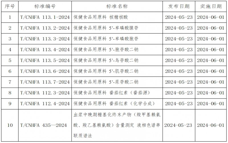 中國營養保健食品協會批準發布《保健食品用核糖核酸》(T/CNHFA 113.1-2024)等10項團體標準,現予公告,自2024年6月1日起實施。
