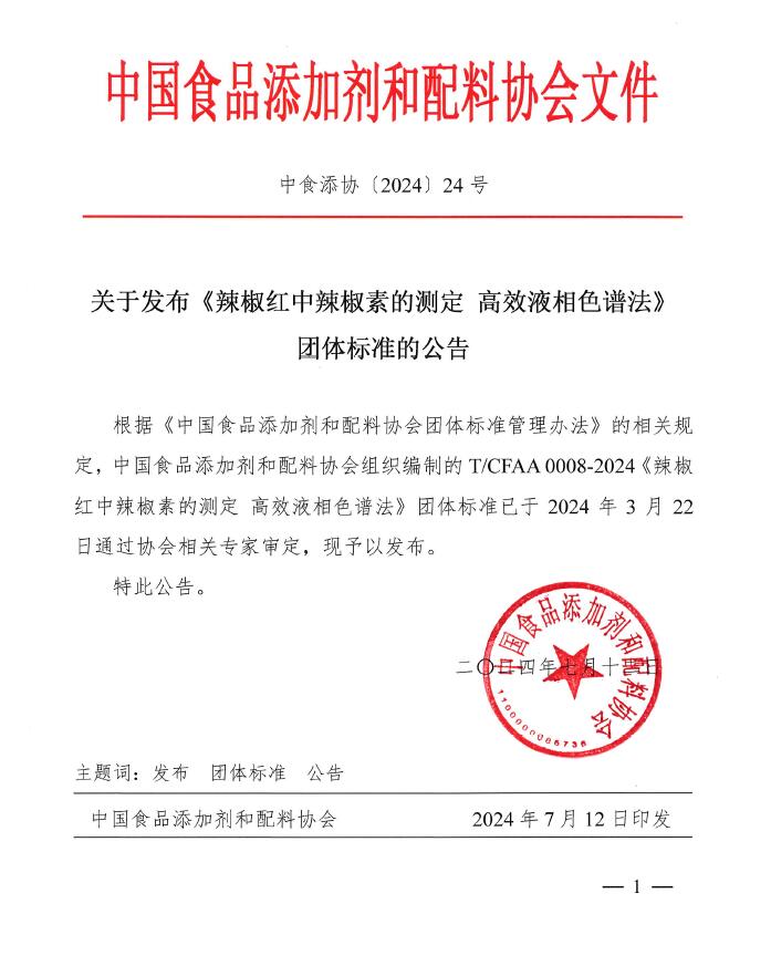 中國食品添加劑和配料協會關于發布《辣椒紅中辣椒素的測定 高效液相色譜法》團體標準的公告(中食添協[2024]24號)