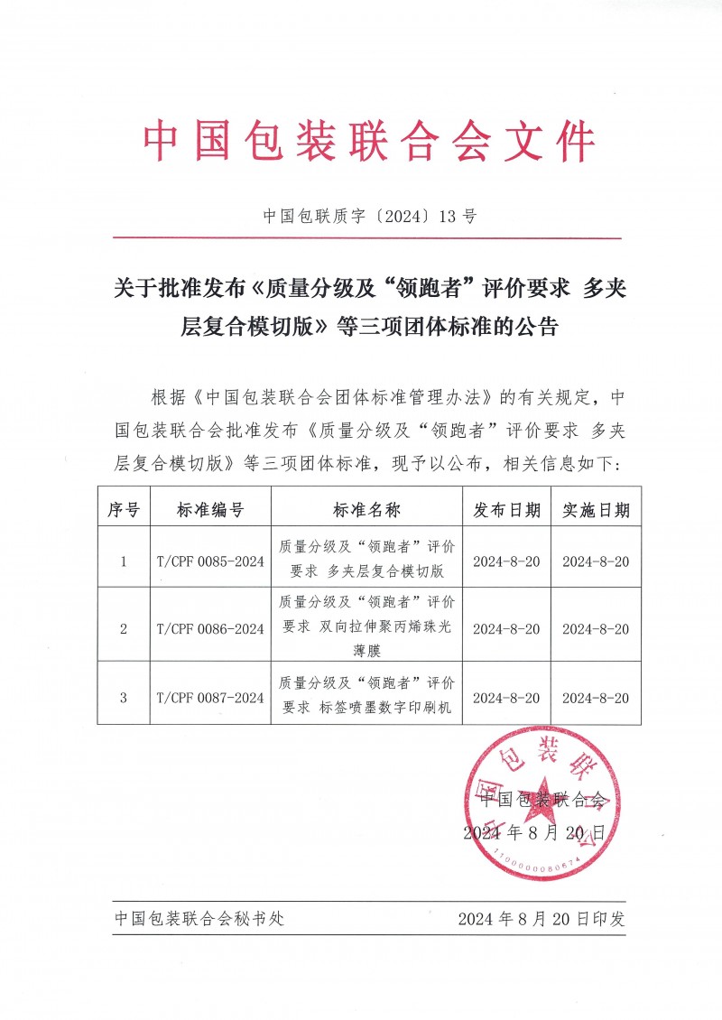 中國包裝聯合會關于批準發布《質量分級及“領跑者”評價要求 雙向拉伸聚丙烯珠光薄膜》等三項團體標準的公告(中國包聯質字[2024]13號)