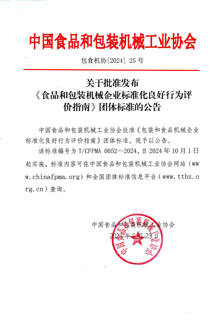中國食品和包裝機械工業協會關于批準發布《食品和包裝機械企業標準化良好行為評價指南》團體標準的公告(包食機協[2024]25號)