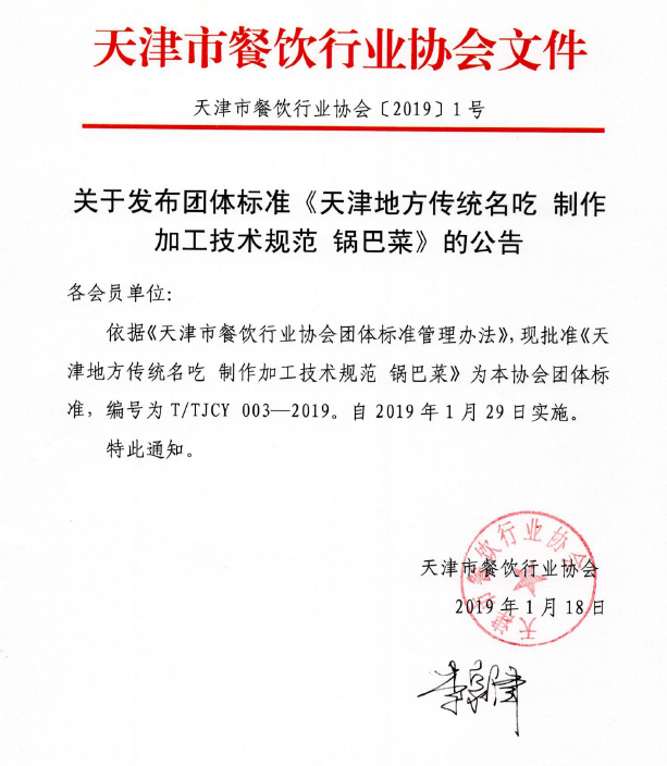 依據《天津市餐飲行業協會團體標準管理辦法》,現批準《天津地方傳統名吃 制作加工技術規范 鍋巴菜》為本協會團體標準,編號為T/TJCY 003—2019。自2019年1月29日實施。
