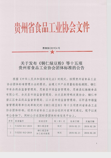 1 | T/GZSX 011-2019 | 銅仁綠豆粉 | 制定 | 2019.02.21 | 2019.02.28 |