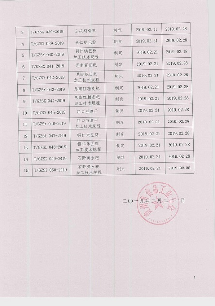 11 | T/GZSX 046-2019 | 江口豆腐干加工技術規程 | 制定 | 2019.02.21 | 2019.02.28 |