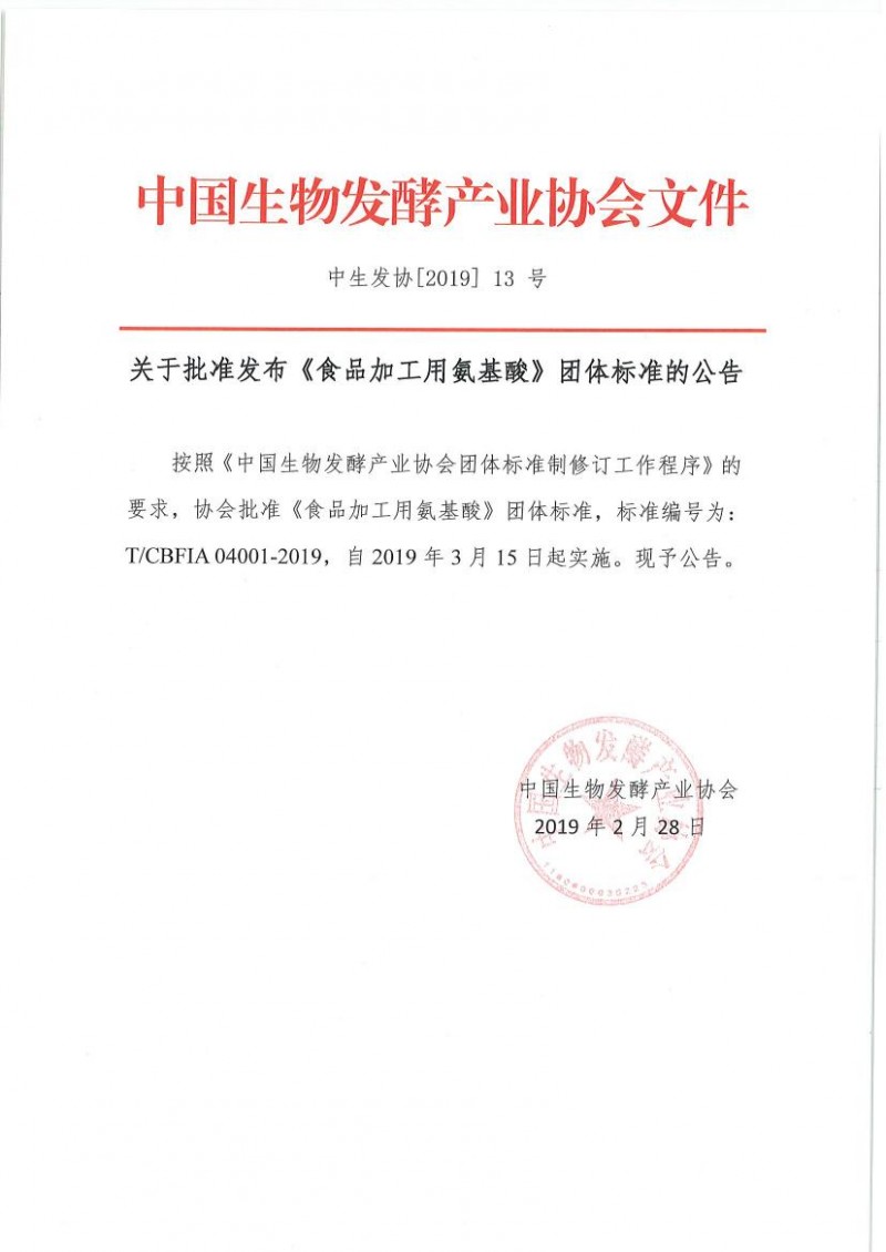 中國生物發酵產業協會關于批準發布《食品加工用氨基酸》團體標準的公告(中生發協[2019]13號)