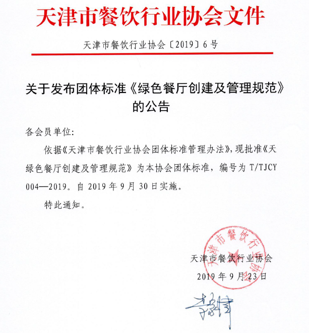 依據《天津市餐飲行業協會團體標準管理辦法》,現批準《綠色餐廳創建及管理規范》為本協會團體標準,編號為T/TJCY 004—2019。自2019年9月30日實施。