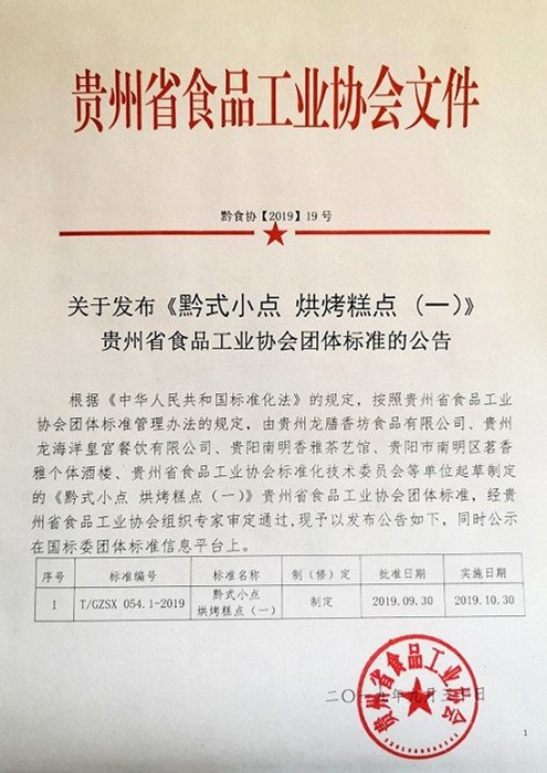 1 | T/GZSX 054.1-2019 | 黔式小點(diǎn)烘烤糕點(diǎn)(一) | 制定 | 2019.09.30 | 2019.10.30 |