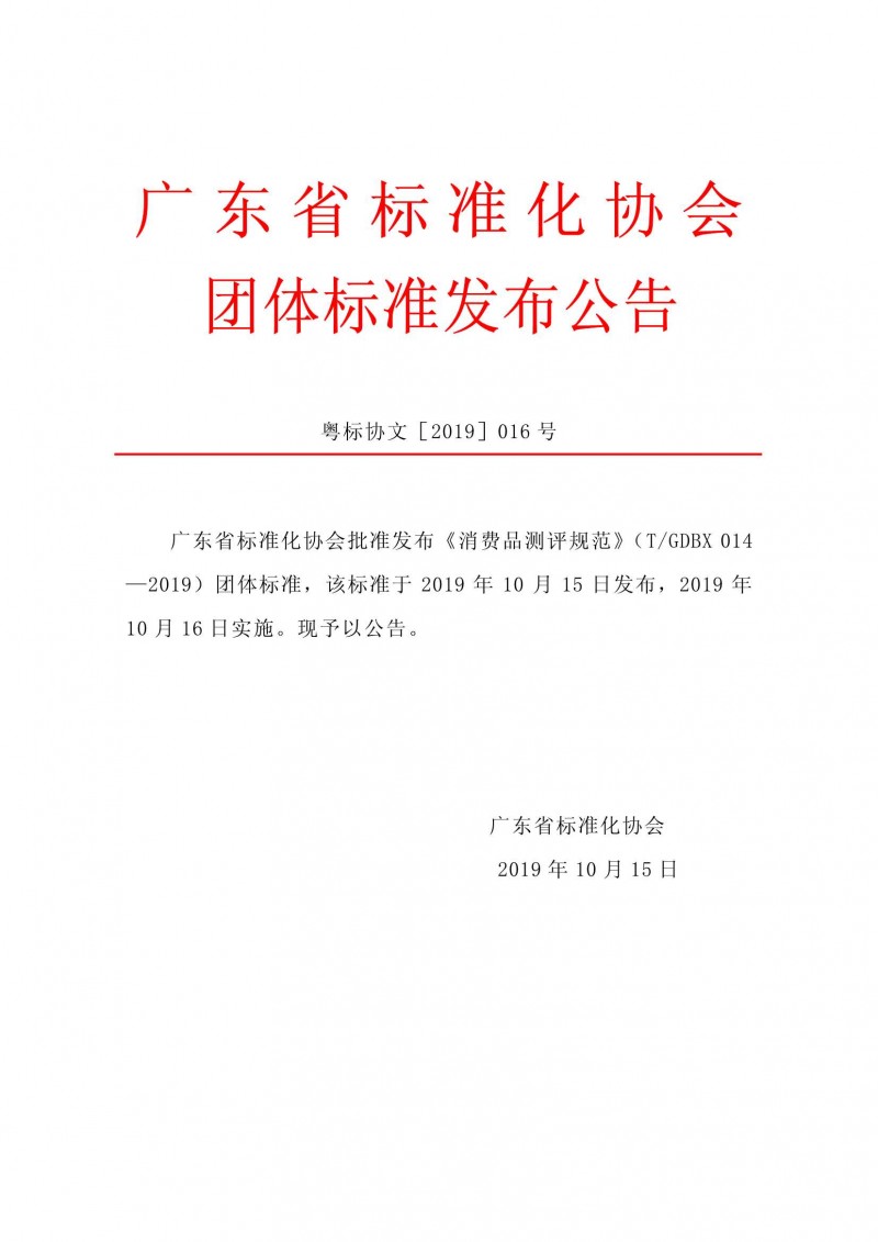 廣東省標準化協會關于廣東省標準化協會批準發布《消費品測評規范》團體標準的公告(粵標協文[2019]016號)