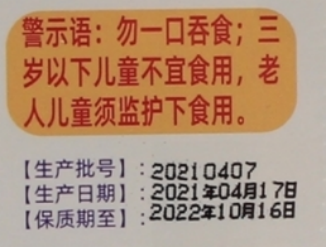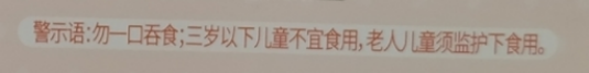 Ø 標示內容:警示語和食用方法,標示為“勿一口吞食;三歲以下兒童不宜食用,老人兒童須監護下食用”。