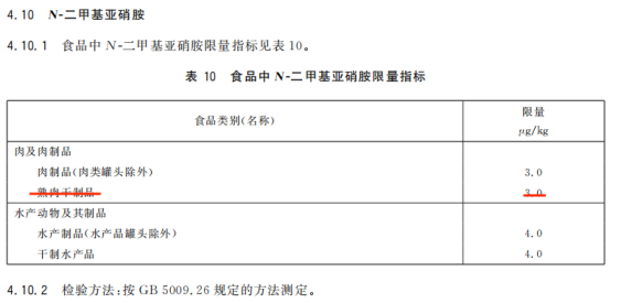 擬刪除“表10 食品中N-二甲基亞硝胺限量指標(biāo)”中“熟肉干制品”及其對(duì)應(yīng)的“3.0 μg/kg”限量(見(jiàn)下圖2)。不影響熟肉干制品中 N-二甲基亞硝胺限量為 3.0μg/kg 的規(guī)定。