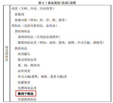 擬在附錄 A “表 A.1 食品類別(名稱)說(shuō)明”“熟肉制品”中增加“熟肉干制品”的食品類別(見(jiàn)下圖3)。此修訂明確和細(xì)化了食品類別,提升了標(biāo)準(zhǔn)的可操作性和透明度,便于準(zhǔn)確確認(rèn)食品分類。