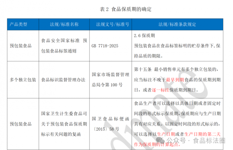 預包裝食品的保質期與生產日期要有明確的對應關系,對于多個獨立包裝的保質期到期日的標識給出了明確的規定。具體可參照表2.