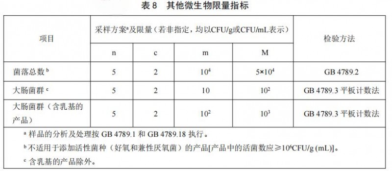 新增菌落總數和大腸菌群限量要求以及檢驗方法,同時對限量指標的不適用情況進行解釋說明。