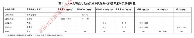 大眾食物強化即在公眾廣泛消費的特定食品中,添加一種或多種微量營養素,和(或)其他營養成分的行為,以改善居民營養缺乏狀況。通常由政府部門倡導。大眾食物強化中營養強化劑的使用規定位于意見稿的附錄A,其中包含的大眾食物包括“01.01.03.01 營養強化乳”“02.01.01.01植物油”“06.02.01大米”“06.03.01小麥粉”“12.04醬油”。附表A.1中列出了我國居民比較缺乏且容易強化的營養素,作為大眾食物強化中優先強化的營養素。對于大眾食物載體中的其他營養素,定位為可選擇強化的營養素,列入表A.2中,并規定如進行大眾強化,優先按表 A.1 強化所列的全部營養素,可同時根據附表 A.2 強化其他營養素和營養成分。