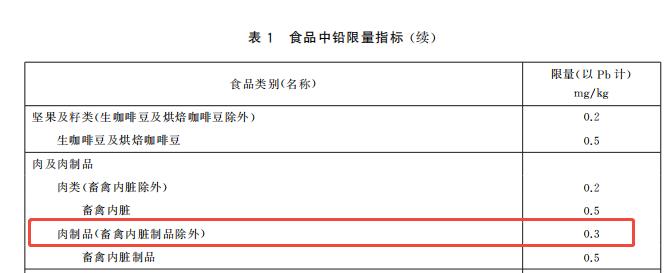 如肉類干制品鉛含量,按照表1中肉制品的限量要求為0.3 mg/kg(以Pb計)。