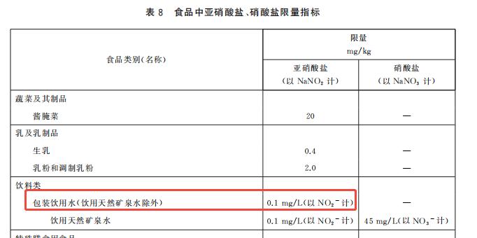 將“4.8亞硝酸鹽、硝酸鹽”表8中包裝飲用水(飲用天然礦泉水除外)中亞硝酸鹽限量由0.005mg/L修訂為0.1mg/L(與飲用天然礦泉水中亞硝酸鹽限量一致)。