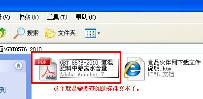 解壓后會在壓縮文件相同位置出現一個文件夾。雙擊打開這個文件夾,一般會看到兩個文件,其中一個是食品伙伴網下載文件說明.htm。另一個就是需要查看的標準文件了。如圖2:
