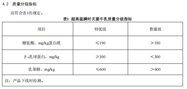 意見稿針對超高溫瞬時滅菌牛乳進行分級,分為特優級和普通級。其中,超高溫瞬時滅菌牛乳是指僅以生牛乳為原料,經超高溫瞬時滅菌、無菌灌裝等生產工藝制得的液體產品,參考GB 25190中超高溫滅菌乳定義。分級的前提首先必須滿足《食品安全國家標準 滅菌乳》(GB 25190)的基本要求,然后再進行分級,具體判定原則如下: