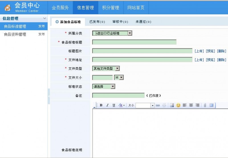 上傳時帶*的為必填項,食品標準上傳界面如圖:(食品資料上傳界面類似)