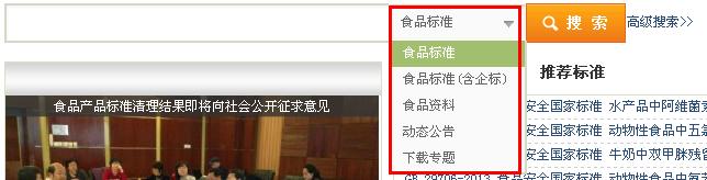 查找標準、資料、動態公告和專題都分別有不同的欄目。其中下拉列表為食品標準(含企標),搜索出來的結果中包含已經公開發布的部分省市的企業標準,可以作為自己編制企業標準的參考資料。