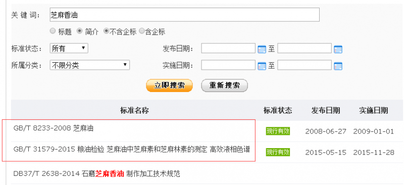 直接輸入芝麻香油搜索結果為空,改用高級搜索,把標題搜索調整為簡介搜索,從搜索結果可以看出芝麻香油沒有單獨的標準,而是芝麻油標準包含了芝麻香油。
