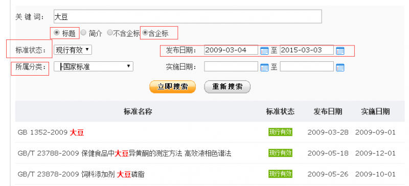 直接輸入大豆,查到的結果有100多條。逐個篩選國家標準比較費時,效率不高。此時可以采用高級搜索,所屬分類里選擇國家標準,標準狀態選擇現行有效,發布日期選定范圍,這樣搜索結果就會減少很多。如果只想查找企業標準,同樣可以選擇含企標,同時選擇分類為食品安全企業標準。