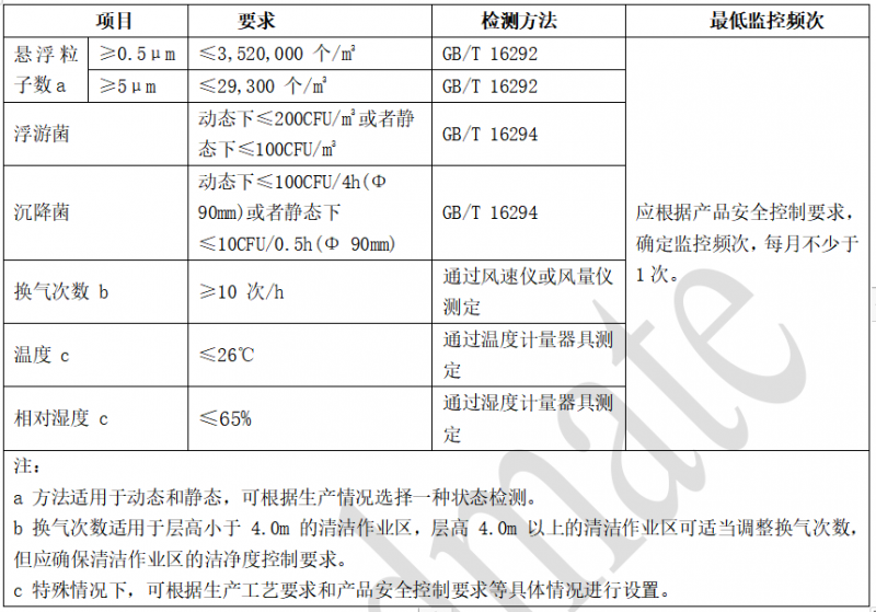 要符合GB 14881 的相關(guān)規(guī)定,同時(shí)增加了生產(chǎn)作業(yè)區(qū)劃分的一般原則、清潔作業(yè)區(qū)的控制要求、前處理工序作業(yè)區(qū)的要求等。清潔作業(yè)區(qū)的控制要求詳見表1。
